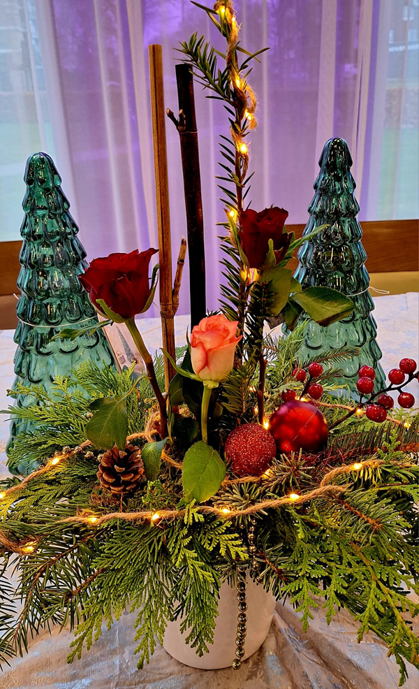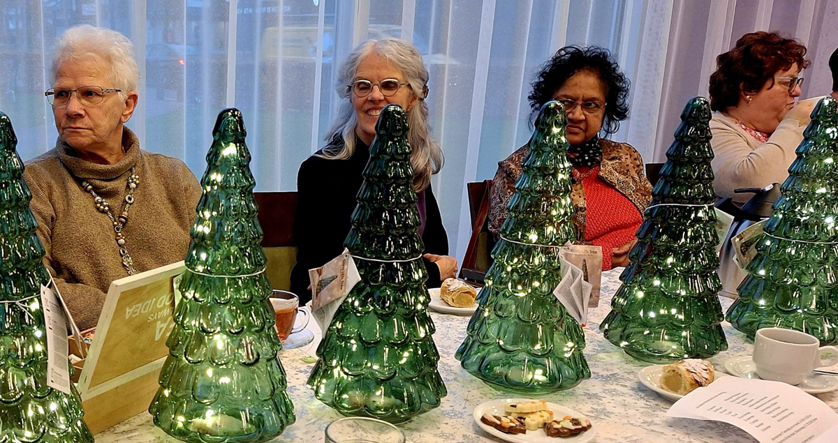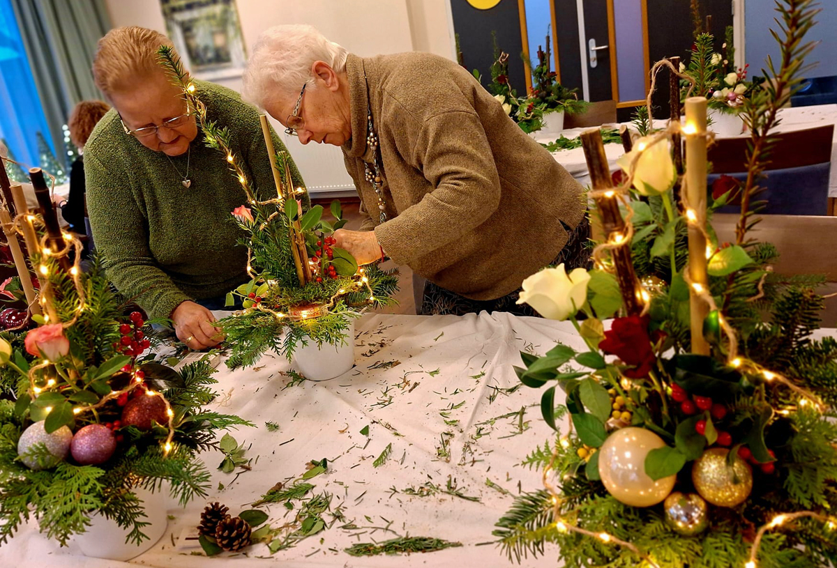 Met begeleiding van Joke je eigen kerststukje maken, is toch geweldig. Daarna genieten van koffie met allerlei lekkers en een mooi lichttje op tafel met een kerstverhaal tot besluit.