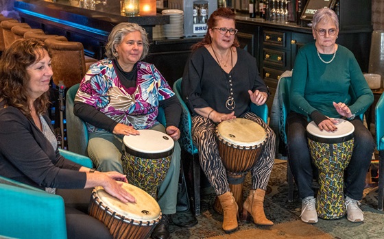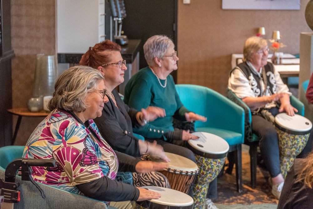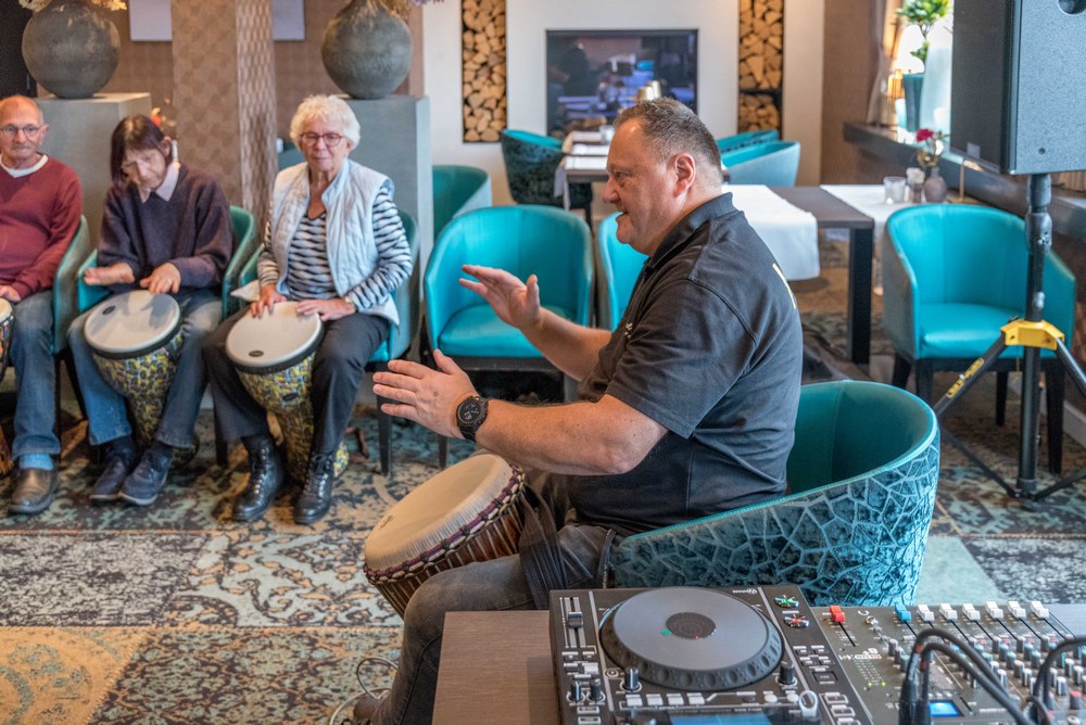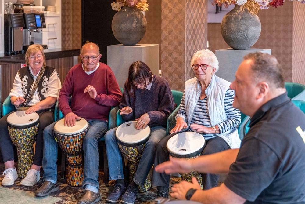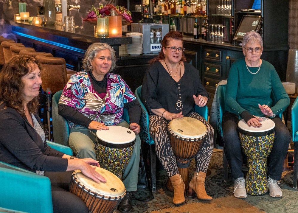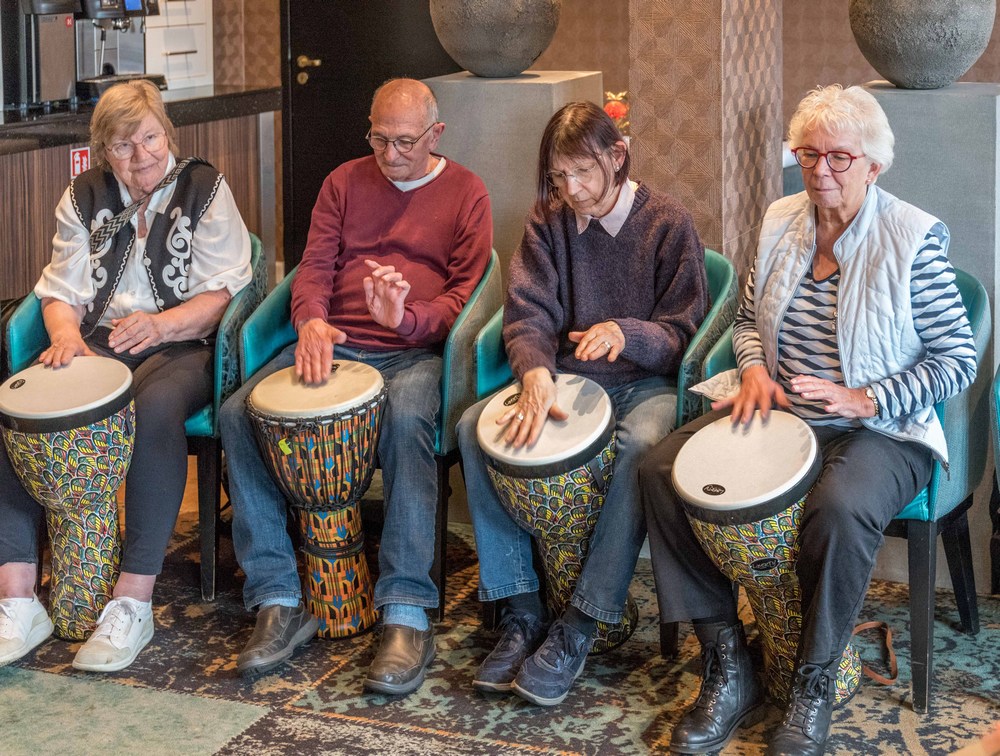 Henk Busscher leerde maandag 11 november de deelnemers de fijne kneepjes van het spelen op de djembé; een West-Afrikaanse bekervormige trommel die met de hand bespeeld wordt.