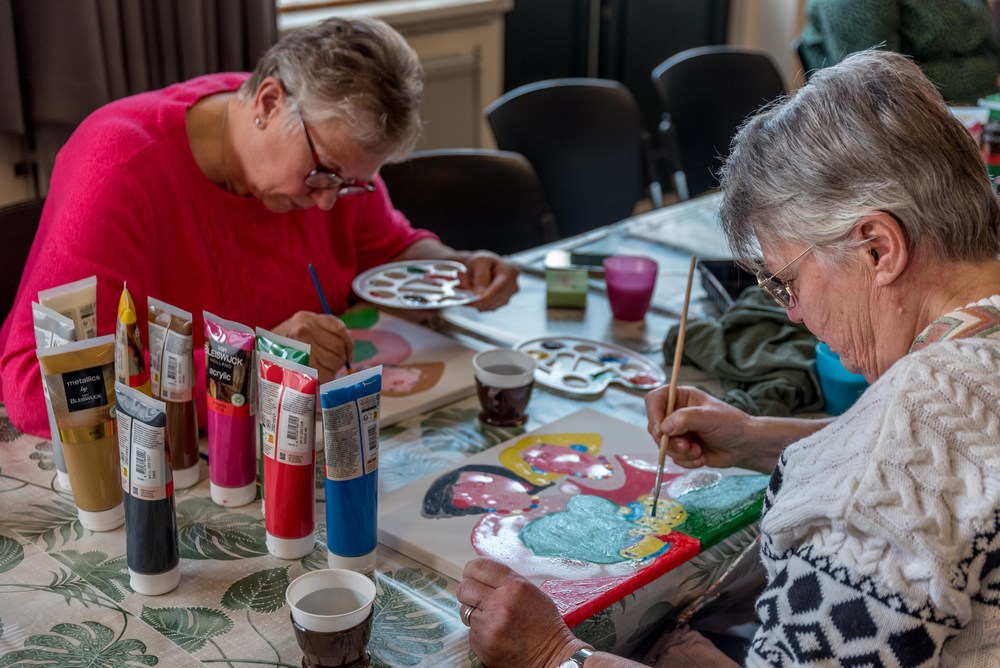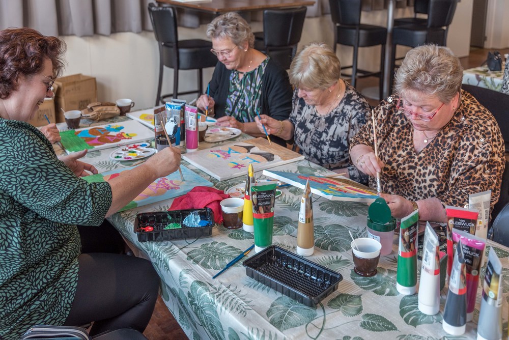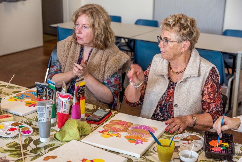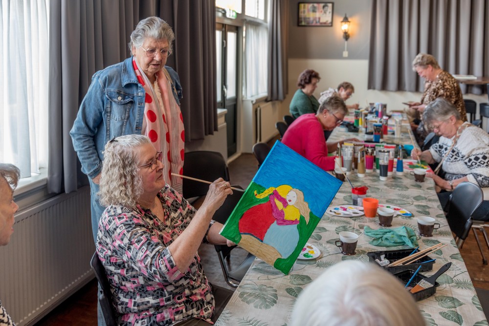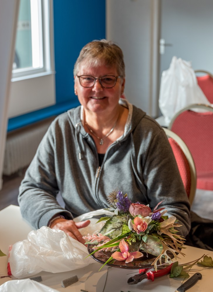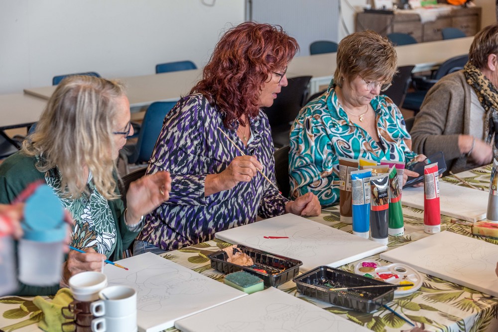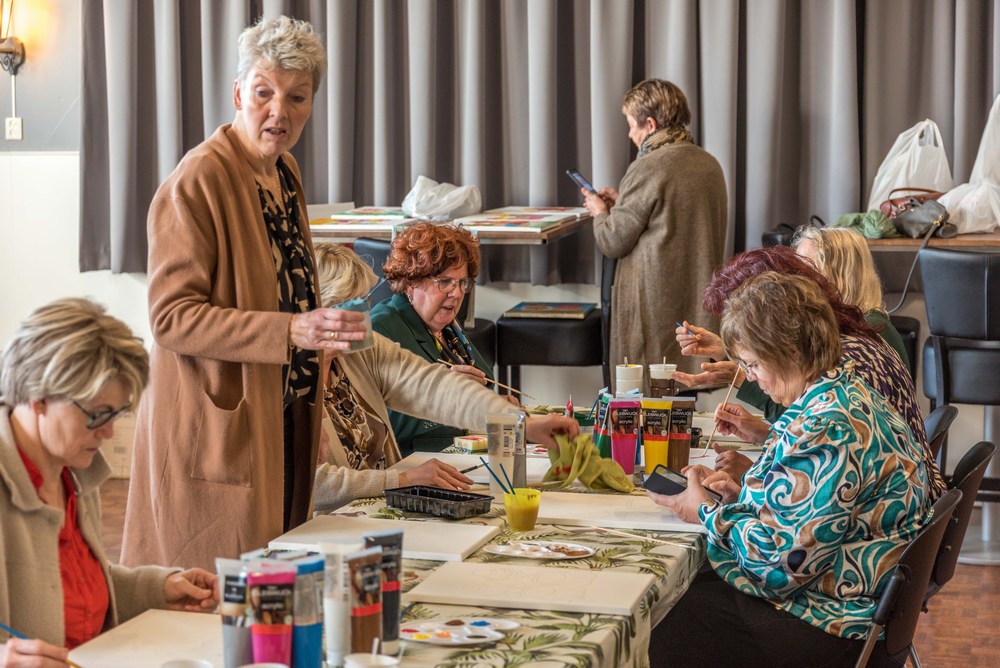 De belangstelling voor deze ochtend was groot, de ene groep begon met het maken van een prachtig bloemstuk en de andere groep ging aan de slag met het maken van een schilderij met acrylverf. Halverwege de ochtend werd er gewisseld zodat iedere deelnemer met twee creaties naar huis ging.