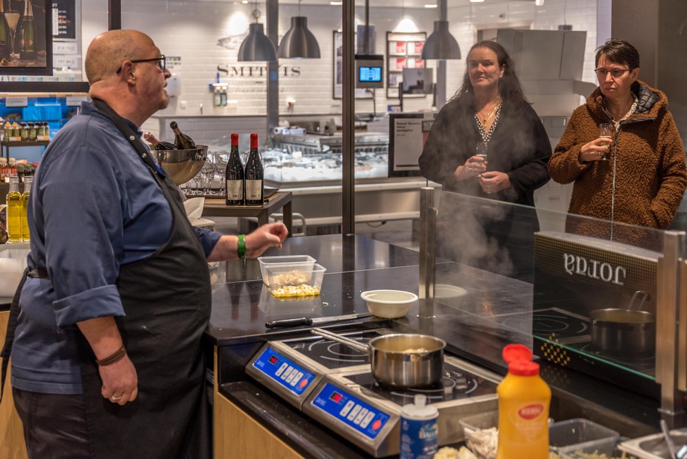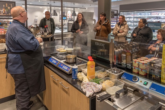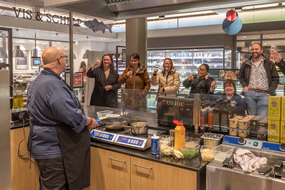 De deelnemers aan deze workshop in de proeftuin van de Sligro in Emmen leerden zaterdag 16 november hoe ze in korte tijd een gezonde maaltijd op tafel kunnen zetten. Na afloop kregen de deelnemers een mand vol producten mee om het recept thuis nog eens te maken.